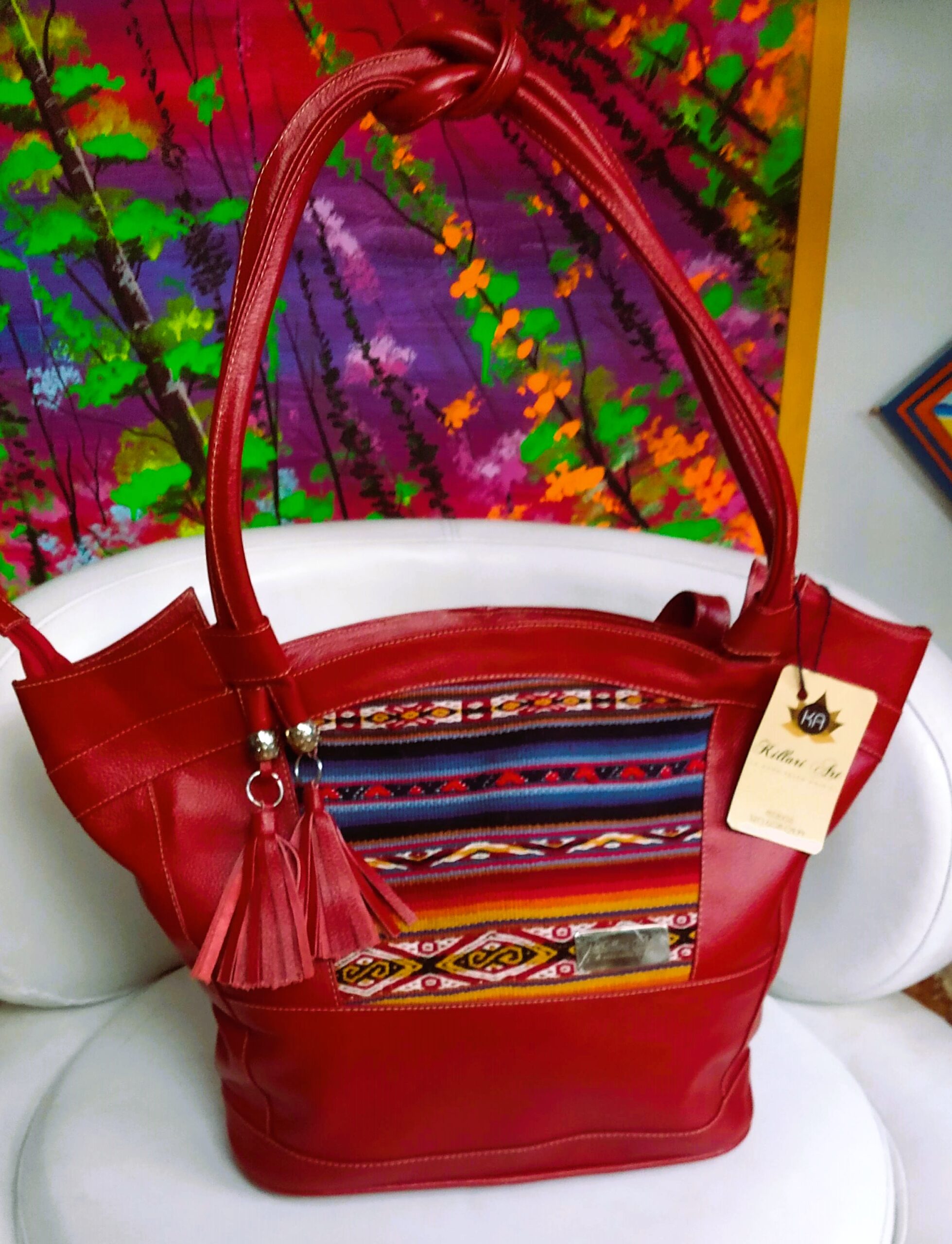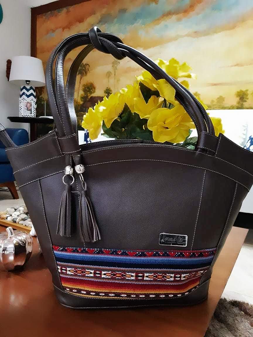 Fusión entre la fuerza del cuero vacuno y la riqueza del tejido peruano. Una pieza que honra la tradición andina y la transforma en diseño contemporáneo. Materiales premium, Hecho a mano, Edición limitada